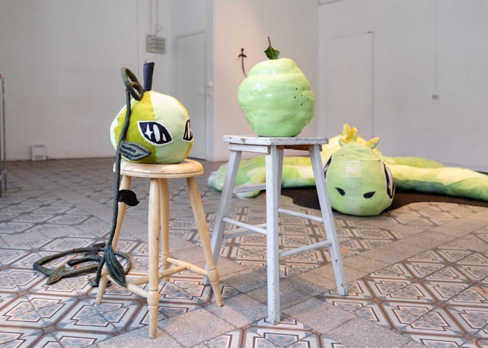 Left: Helmi Nieminen, Pompoen, 2025, recycled textile, stuffing, fabric paint
